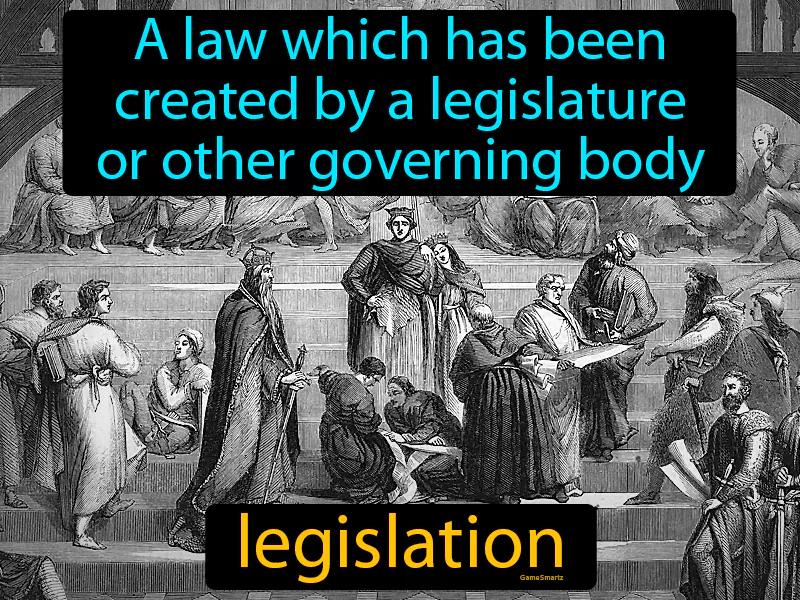 Legislation: A law which has been created by a legislature or other governing body. Legislation. In History, legislation refers to laws that governments create to structure society and resolve issues.