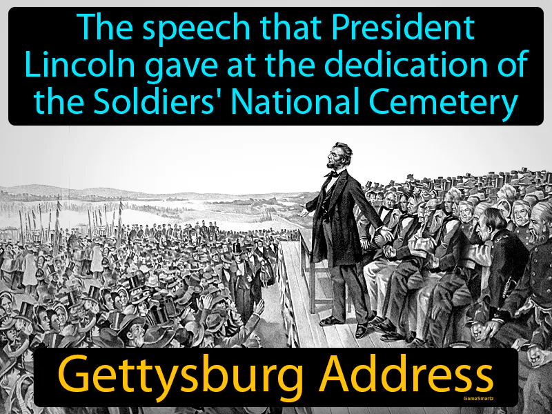 Gettysburg Address: The speech that President Lincoln gave at the dedication of the Soldiers' National Cemetery. Gettysburg Address. The Gettysburg Address is a famous speech by President Abraham Lincoln during the American Civil War, emphasizing the principles of equality and national unity.