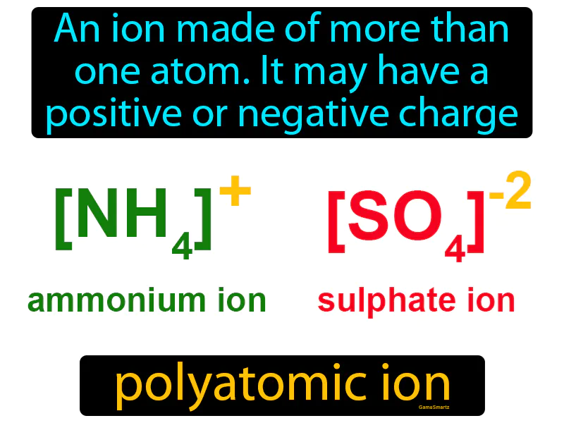 Polyatomic Ion: An ion made of more than one atom, it may have a positive or negative charge. Polyatomic ion. A polyatomic ion is a group of bonded atoms that together have an overall electric charge.