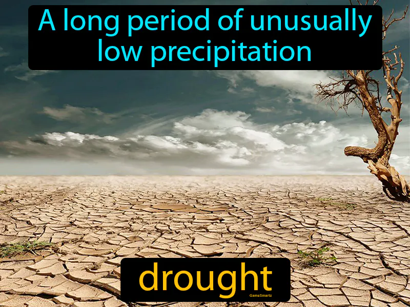 Drought: A long period of unusually low precipitation. Drought. Drought is when an area gets much less rain than usual, causing water shortages.