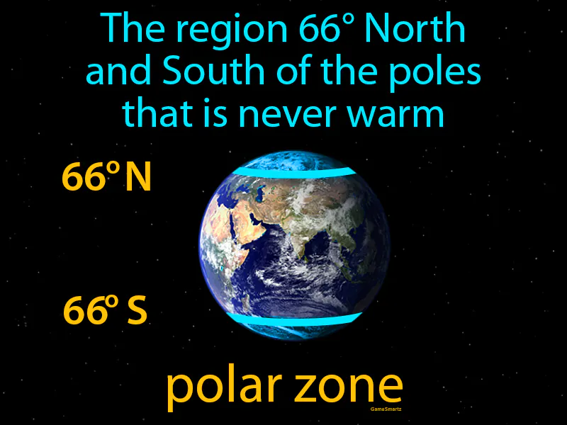 Polar Zone: The region 66 North and South of the poles that is never warm. Polar zone. The polar zone is the icy, cold area around the North and South Poles where the sun's rays are weak, leading to low temperatures.