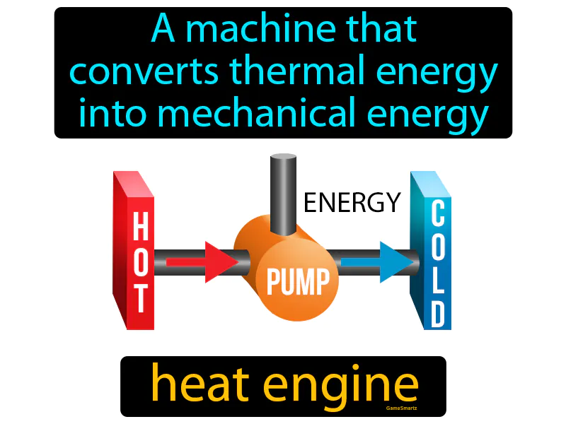 Heat Engine: A machine that converts thermal energy into mechanical energy. Heat engine. A heat engine is a device that turns heat into motion or work.