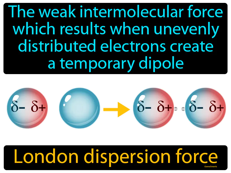 London Dispersion Force: The weak intermolecular force which results when unevenly distributed electrons create a temporary dipole. London dispersion force. London dispersion force is a temporary attractive force that occurs when electrons in adjacent atoms shift, causing a fleeting attraction.