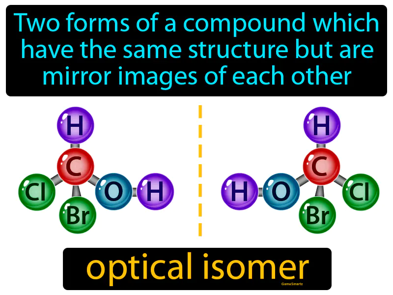Optical Isomer: Two forms of a compound which have the same structure but are mirror images of each other. Optical isomer. Optical isomers are molecules that are like left and right hands they are the same but cannot be superimposed onto each other.