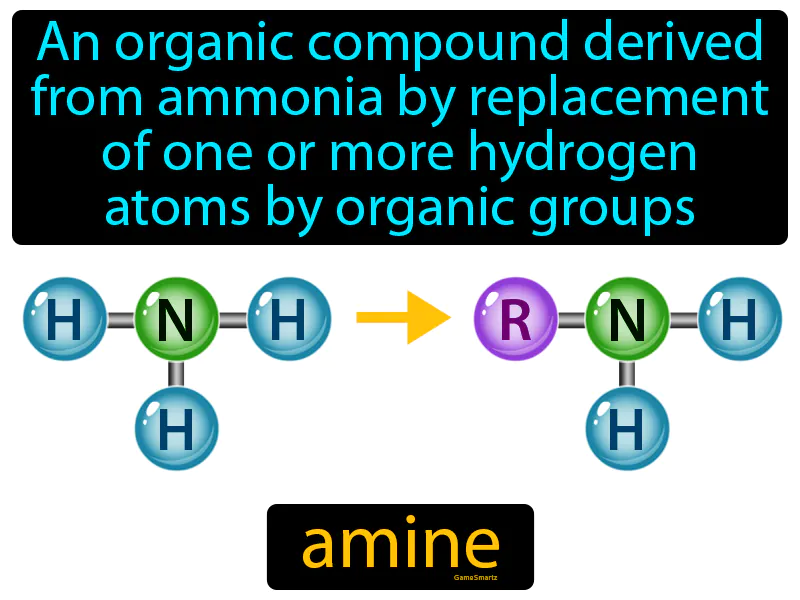 Amine: An organic compound derived from ammonia by replacement of one or more hydrogen atoms by organic groups. Amine. In simple terms, an amine is a molecule that is like ammonia but has one or more hydrogen atoms replaced by carbon-containing groups.