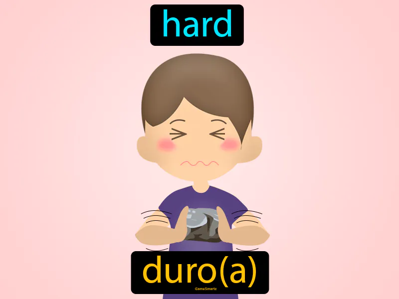 The Spanish word "duro" means "hard" in English. To help you remember this, think of Duro as a character in an action movie—imagine "Duro the Hero," who is as tough as nails and never backs down from a challenge. Just like a hero who is hard to beat, "duro" is your go-to word for anything that's hard or tough. So, whenever you encounter something that's tough like Duro's superhero resolve, you'll remember it's "duro"! 💪
