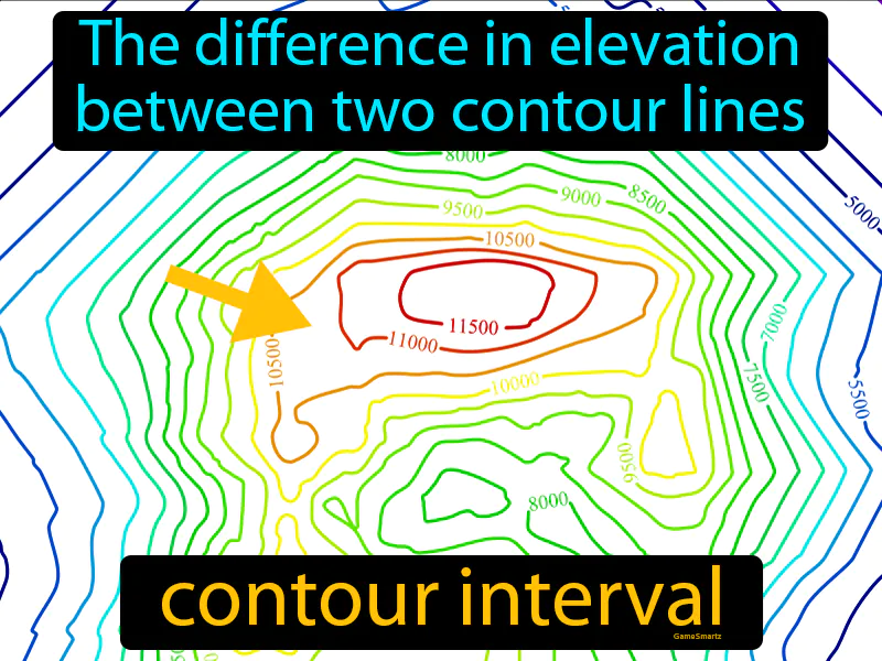 Contour Interval: The difference in elevation between two contour lines. Contour interval. In Science, a contour interval is the vertical distance or difference in height between successive contour lines on a map, showing the slope of the terrain.