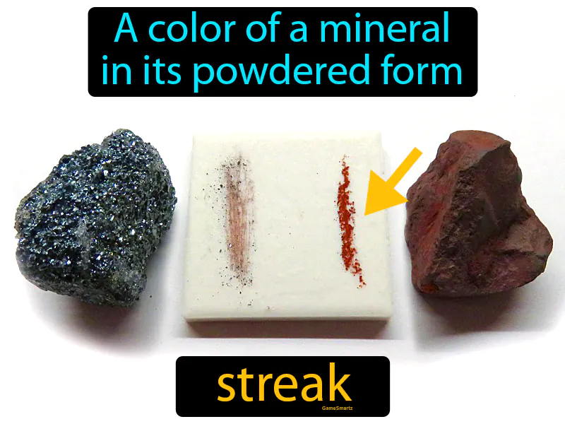 Streak: A color of a mineral in its powdered form streak. Streak is the color left behind when a mineral is scratched across a porcelain tile, helping to identify it.