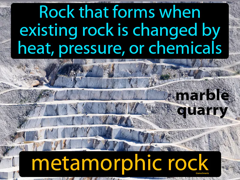 Metamorphic Rock: The rock that forms when existing rock is changed by heat, pressure, or chemicals. Metamorphic rock is rock that has been transformed from another type of rock due to heat and pressure.
