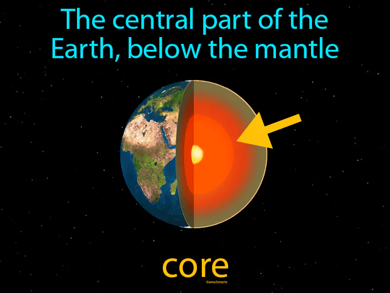Core: The central part of the Earth, below the mantle, is the core. The core is the innermost layer of Earth, made mostly of iron and nickel, and it's responsible for generating our planet's magnetic field.