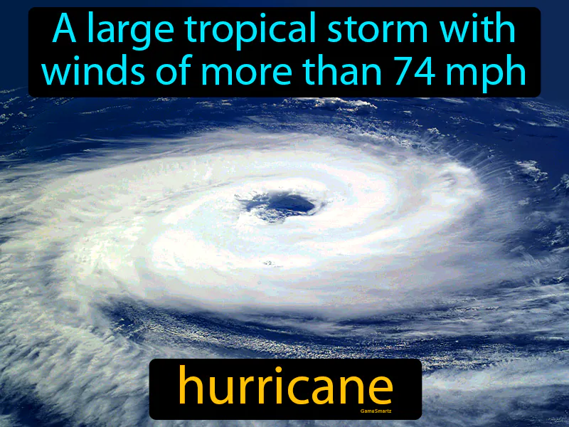 Hurricane: A large tropical storm with winds of more than 74 mph. Hurricane. A hurricane is a powerful storm system with strong winds and heavy rain that forms over warm ocean waters.