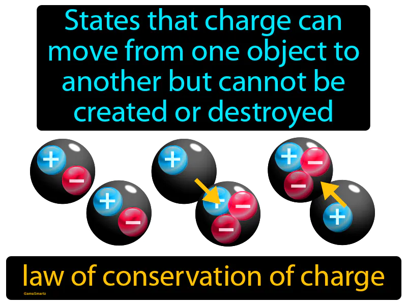 Law Of Conservation Of Charge: States that charge can move from one object to another but cannot be created or destroyed. Law of conservation of charge. This law means that the total charge in a closed system always stays the same.