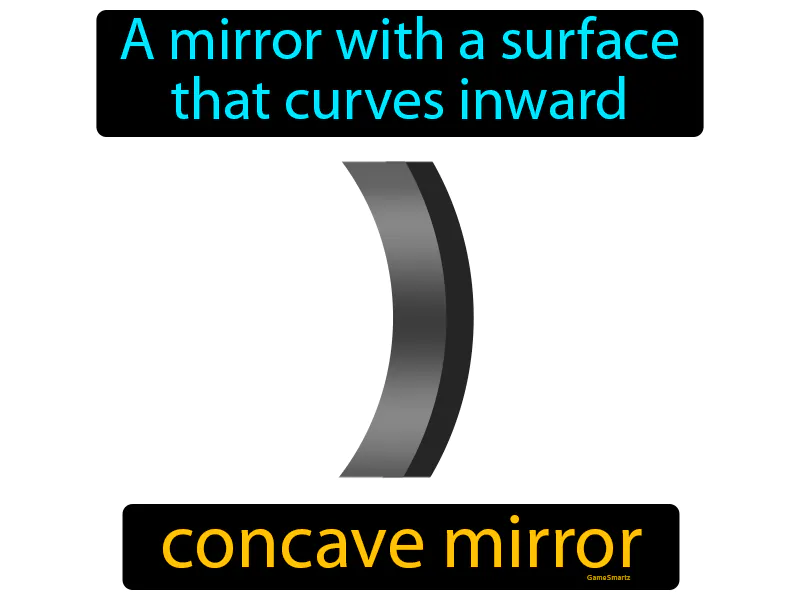 Concave Mirror: A mirror with a surface that curves inward. Concave mirror. A concave mirror focuses light to a point and can make images appear larger when viewed up close.