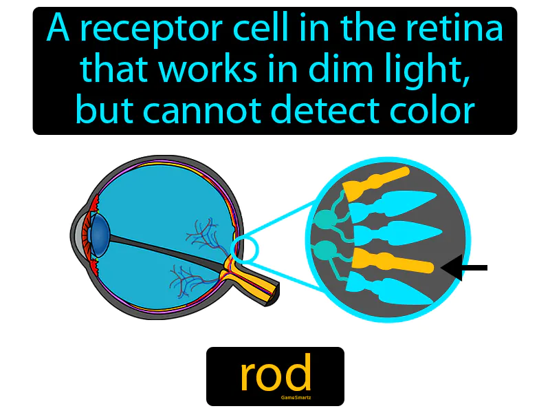 Rod: A receptor cell in the retina that works in dim light, but cannot detect color. Rods are cells in the eye that help us see in low light conditions, but they don't perceive color.