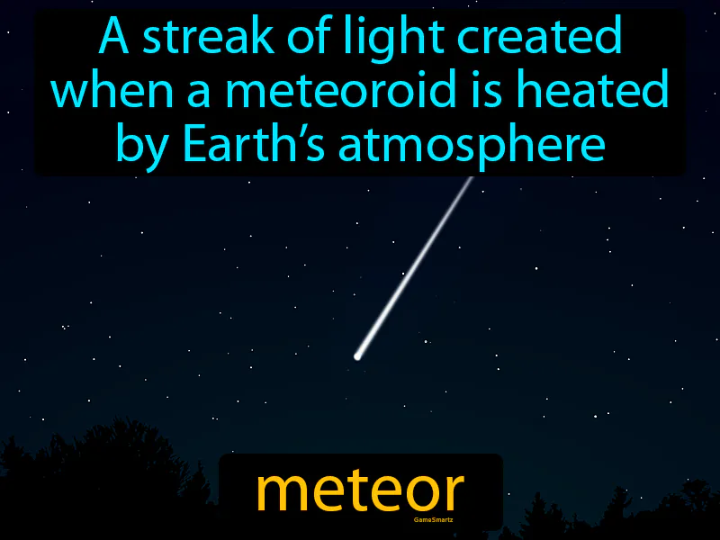 Meteor: A streak of light created when a meteoroid is heated by Earths atmosphere. Meteor. A meteor is a bright trail of light in the sky caused by a space rock burning up as it enters Earth's atmosphere.