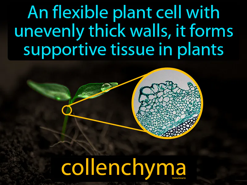 Collenchyma: An flexible plant cell with unevenly thick walls, it forms supportive tissue in plants. Collenchyma is a type of plant cell that provides flexible structural support, especially in areas of growth.