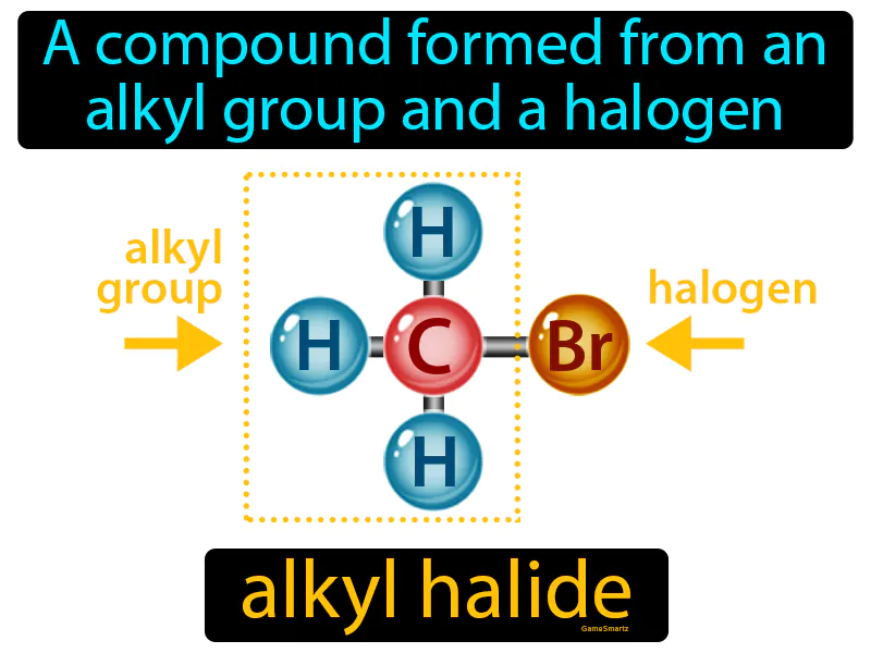 Alkyl Halide: A compound formed from an alkyl group and a halogen. Alkyl halide. An alkyl halide is a chemical compound where a carbon group is bonded to a halogen atom like chlorine or fluorine.