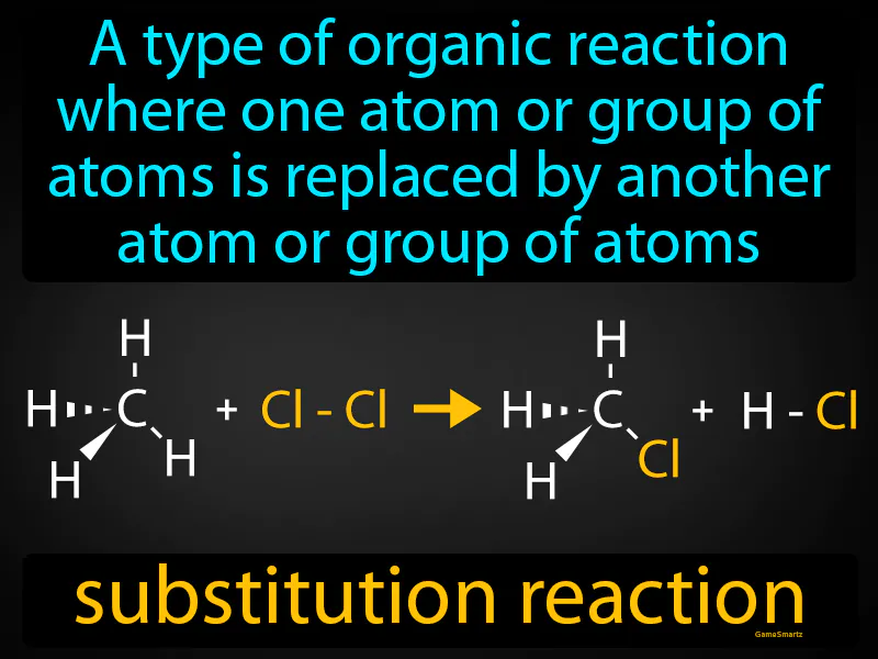 Substitution Reaction: A type of organic reaction where one atom or group of atoms is replaced by another atom or group of atoms. Substitution reaction. In simple terms, a substitution reaction is like swapping one piece of a molecule for another.