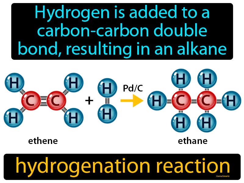 Hydrogenation Reaction: Hydrogen is added to a carbon-carbon double bond, resulting in an alkane. Hydrogenation reaction. A hydrogenation reaction is when hydrogen is added to molecules, often turning unsaturated compounds like oils into saturated ones, like fats.